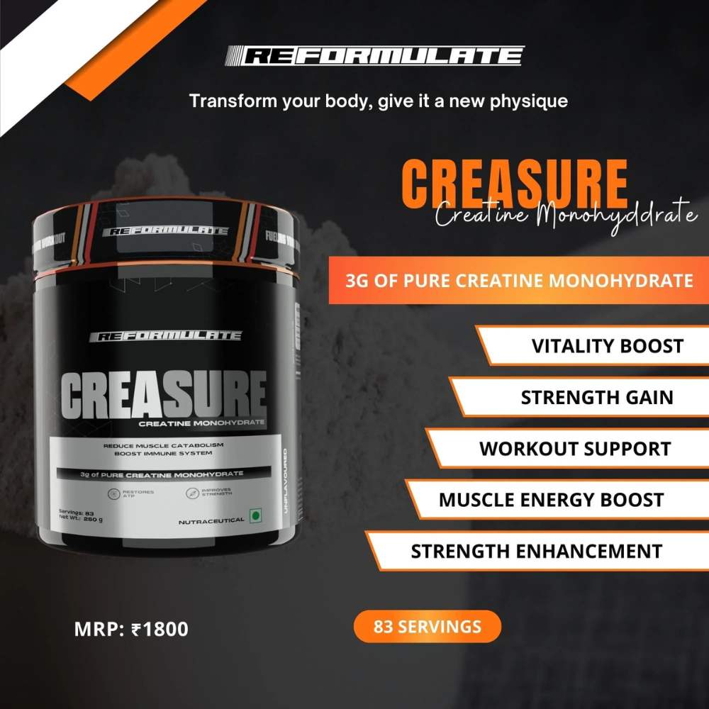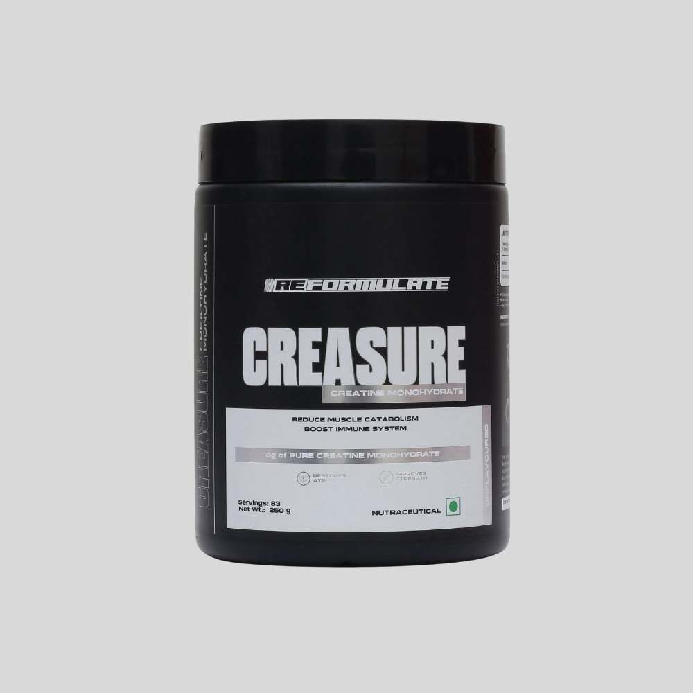 Unlock your peak performance with Creasure Creatine. Each 3g serving delivers 100% pure Creatine Monohydrate—renowned for boosting muscle energy, strength, and size. Designed to power your workouts and speed up recovery, Creasure helps you train harder, lift heavier, and recover faster. Experience reduced fatigue and enhanced endurance, whether you’re lifting in the gym, sprinting on the track, or pushing through high-intensity sessions. With Creasure Creatine, every rep counts—fuel your muscles, maximize your gains, and perform at your best.