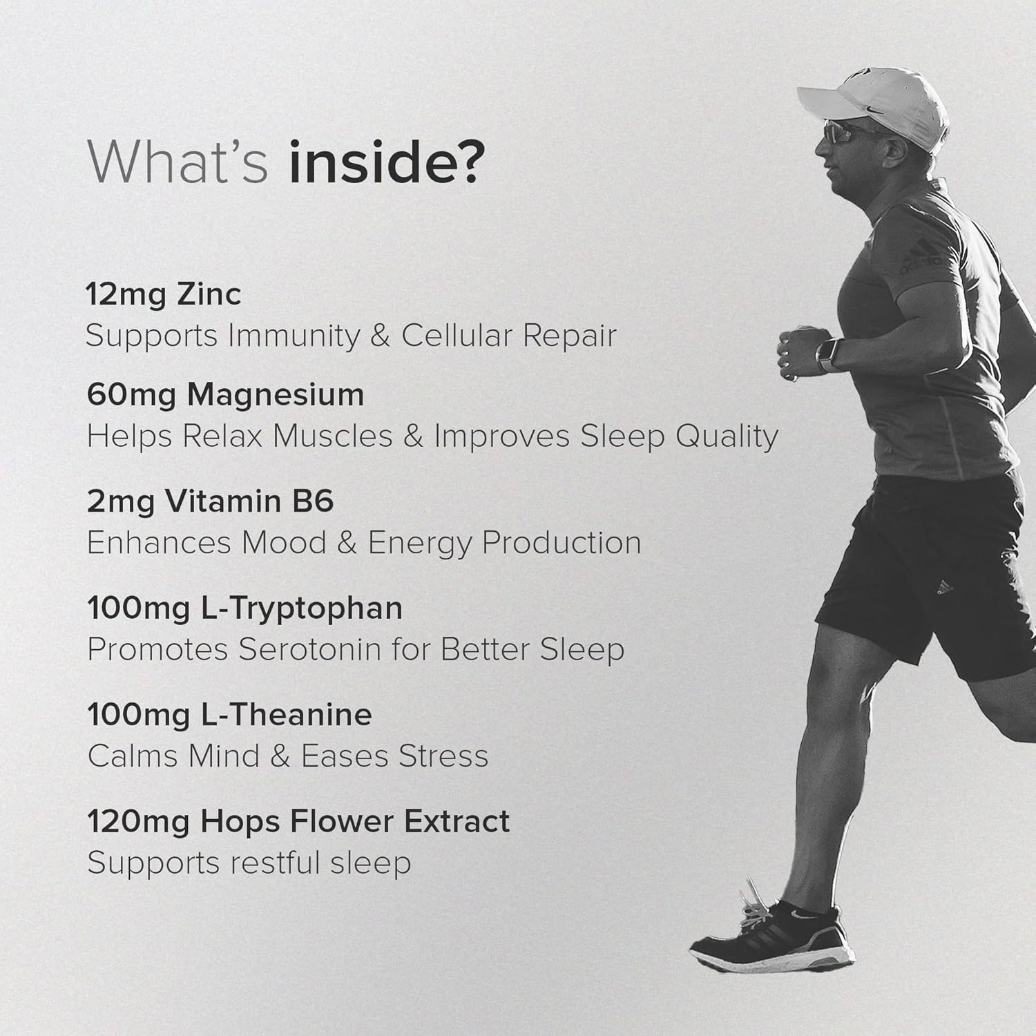 Promotes Restful Sleep & Relaxation – Powered by Hops flower extract, an age-old natural sleep aid, combined with the amino acids L-Tryptophan and L-Theanine. This unique blend calms the mind, reduces restlessness, and helps you achieve deep, restorative sleep without leaving you groggy the next morning.